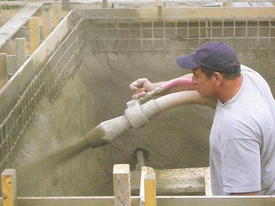 Qu'est ce qui rend les piscines Bonaventure de meilleure qualité ? L’utilisation du Gunite sec qui est un procédé différent de celui du béton projeté utilisant une pompe à béton. Les matériaux utilisés dans le Gunite sec (ciment et agrégat fin) sont projetés à l’état sec à l'aide d'un premier tuyau qui est suivit d'un deuxième qui lui projette de l’eau. Ce processus requière moins d’eau que l’utilisation du béton projeté. Le résultat : un rétrécissement moindre qui offre un ciment plus fort.
